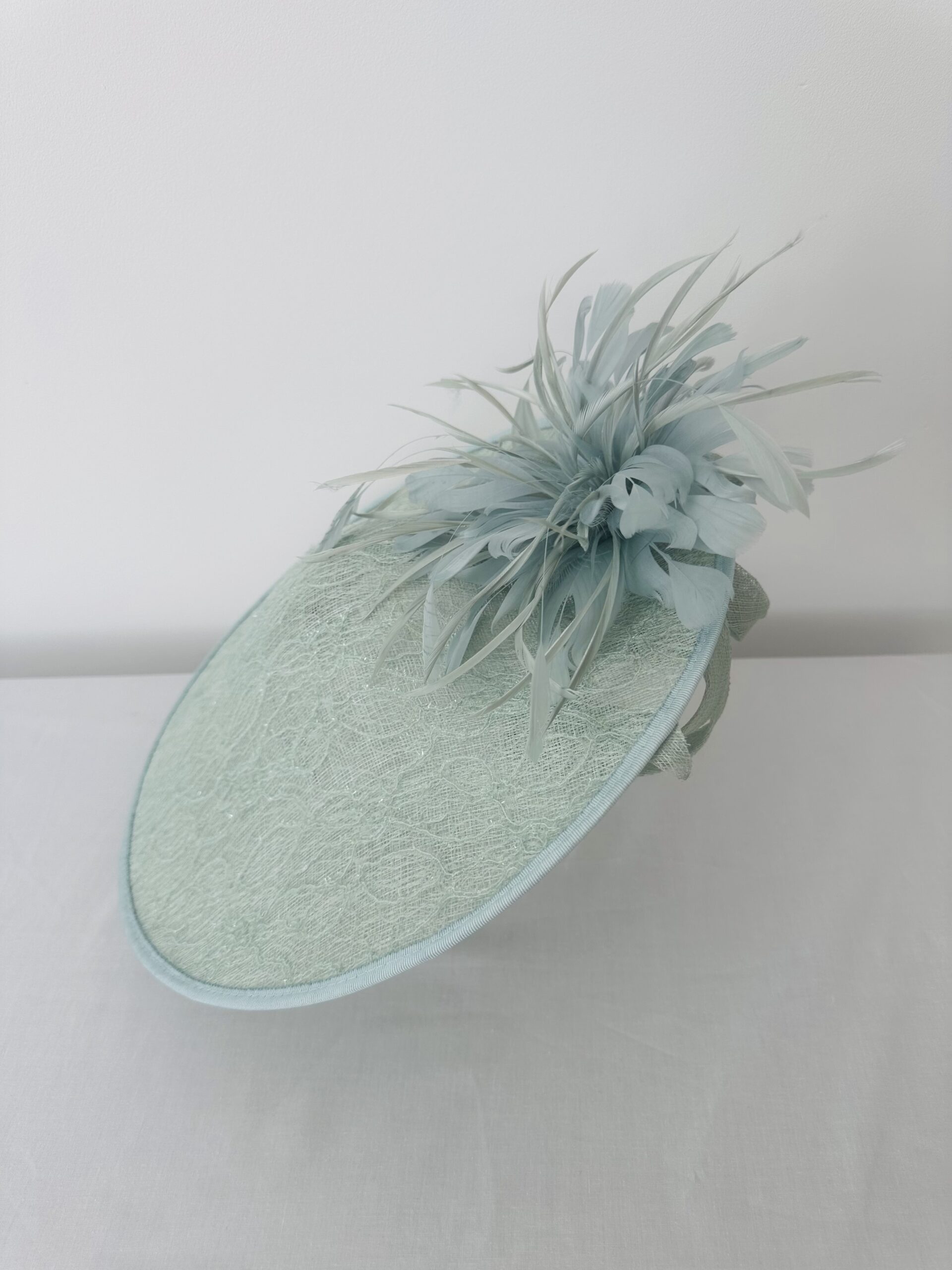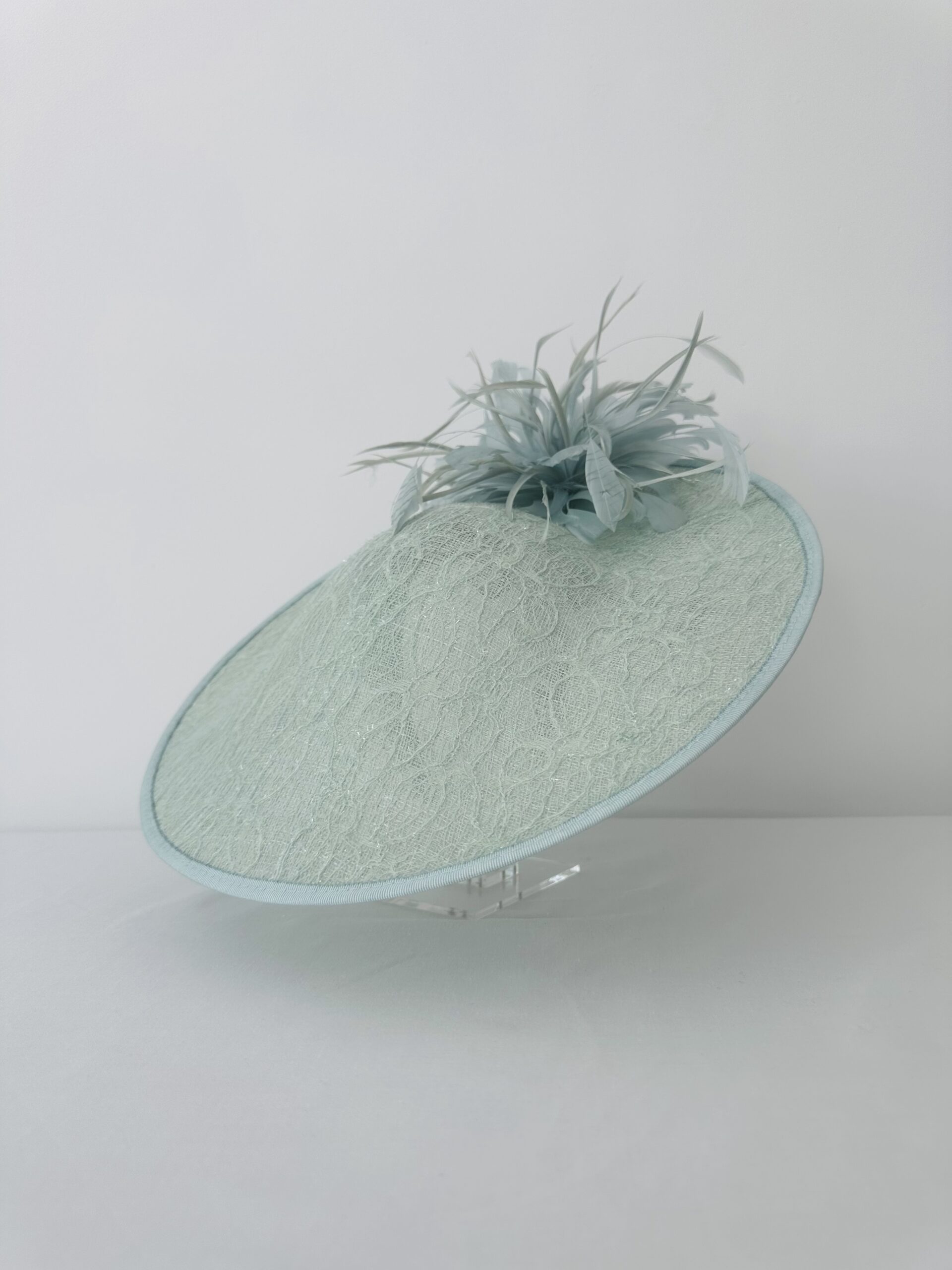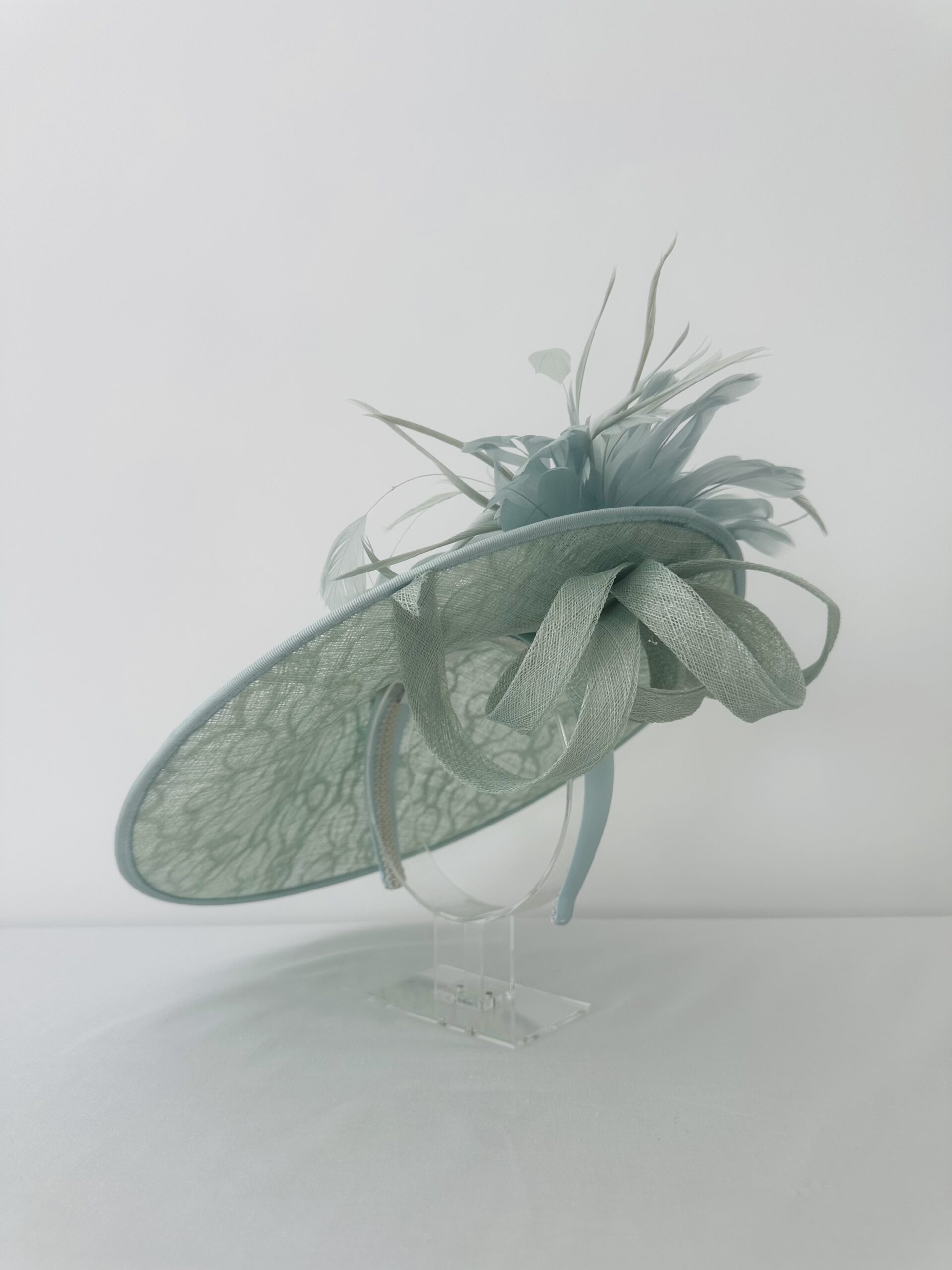 This is a wide brim fascinator adorned with feathers on top and structured curls underneath. It sits on a headband on a slant.